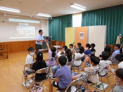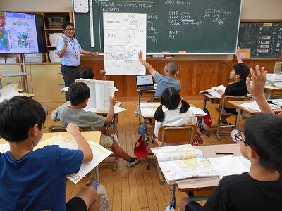 令和7年11月20日(木)に、延岡土地改良区(水土里ネット)の山内様、岩佐様にお越しいただき、4年生児童を対象に、岩熊井堰や農業用水路についてご講話をいただきました。
