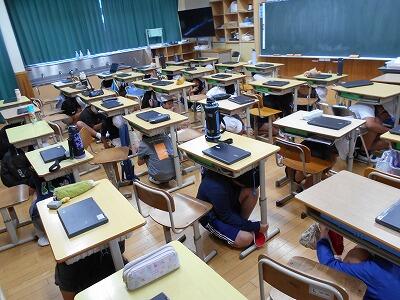 地震発生の放送後、児童たちは机の下に入りました。無言で頭が出ないように体を丸め、椅子の脚をしっかり持ちながらじっと動かない姿が見られました。話す児童もなく全校が静まりかえっていました。
