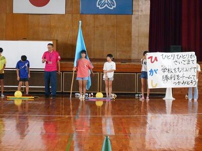 始業式の後に、東小ハンドボール(女子)が、県予選で優勝し全国大会へ出場したので、県予選優勝の表彰をしたところです。