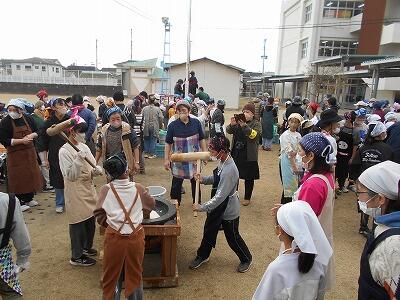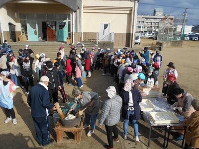 長年の間、東小学校の「もちつき」に携わってくださっている寺田さんを中心とした地域の方々のご協力のもと、今年も「もちつき」を行うことができました。社会福祉協議会の方々や、区長さん、公民館長さん、民生員児童員さん、その他の地域の方、保護者の方々など多くの方々もご協力してくださり、安全に楽しく実施することができました。心より感謝申し上げます。