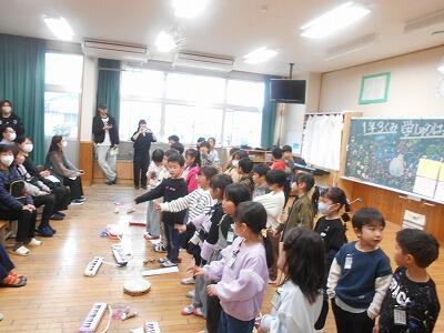 令和7年11月4日(火)に、全校朝会を行いました。その際に、4年生が合唱と合奏を披露してくれました。10日(月)に行われる延岡市の音楽祭で発表します。曲は、合唱曲『プパポ』と合奏曲『ルパン三世のテーマ』です。