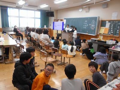 授業のはじめに、児童が交互に練習をした後、教頭の上米良先生、教育実習生の荒木先生、校長(榎本)と児童は1対1で、全員がこの会話を楽しみました。