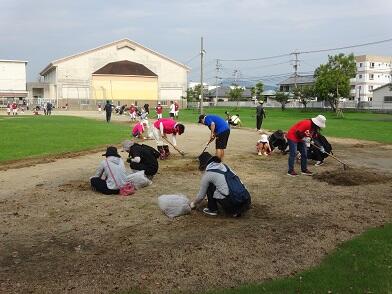 午前7時30分に集合した100名を超す保護者と教職員、児童が、運動場を中心に除草や側溝の掃除に汗を流しました。今回は、10月6日(日)に予定している運動会のための作業でした。