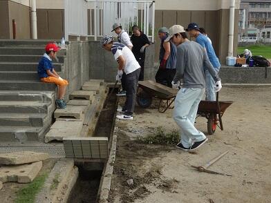 トラックに勢いよく伸びた芝草を丁寧に取り除いたり、重いコンクリート製のふたをはずして土を取り除いたりと、普段子どもと職員だけではできないところを掃除していただきました。毎年のこととはいえ、保護者の皆様の手際の良さに恐れ入りました。