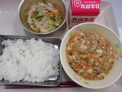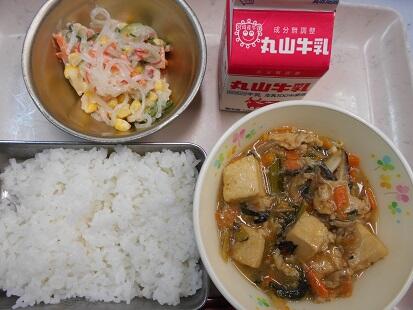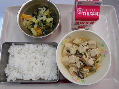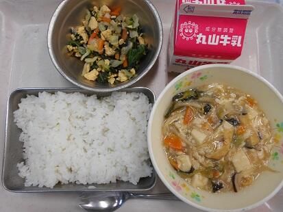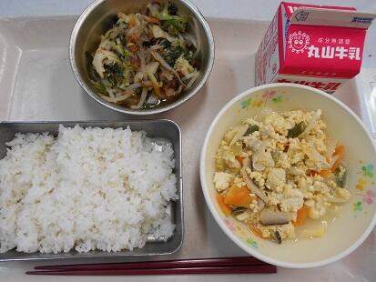 今日の給食は中華です。豆腐と豚肉・もやし・玉ねぎ・人参・たけのこ・しいたけ・にらが入った豆腐の中華煮。ごま油の風味もきいて食欲をそそる香りと、野菜もたくさん食べられる豆腐の中華煮に、サッパリした味のバンサンスーがよく合う給食でした。子どもたちも「美味しかった」とのこと。