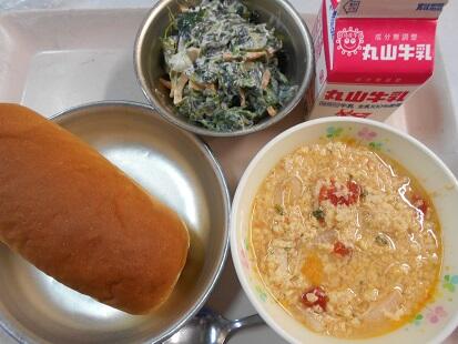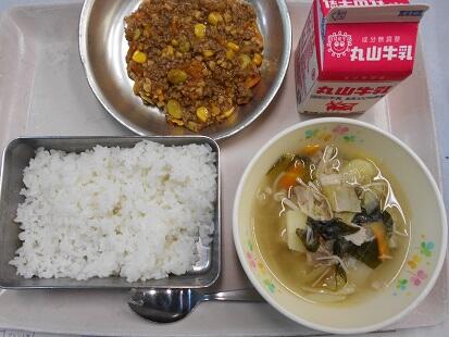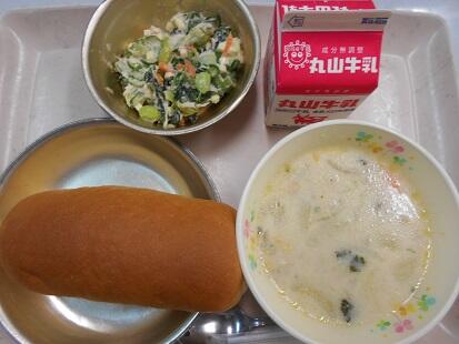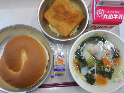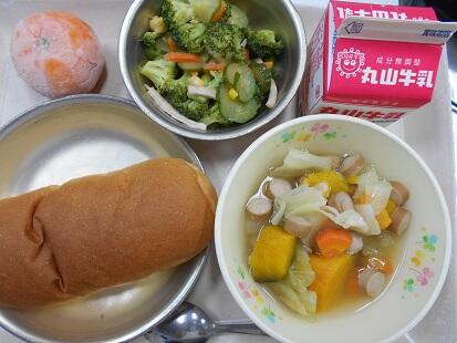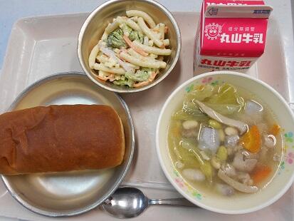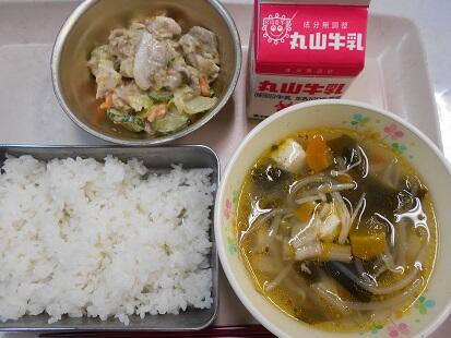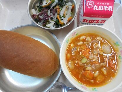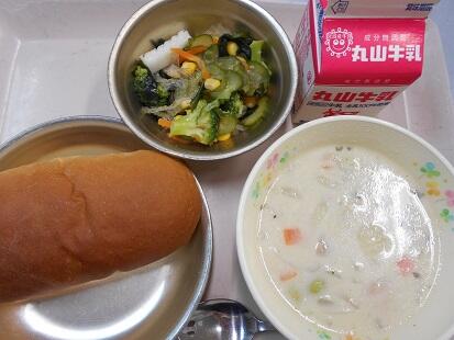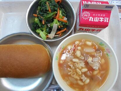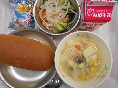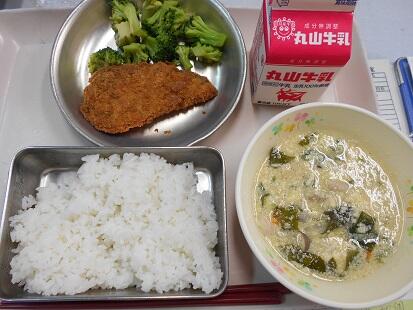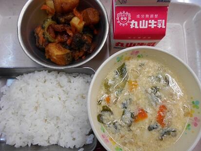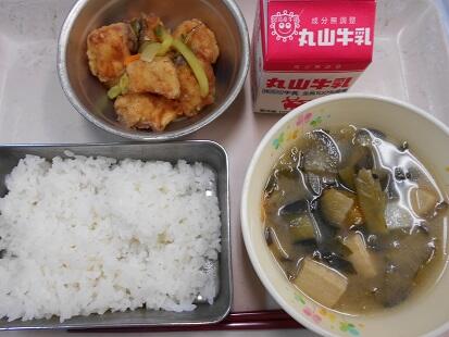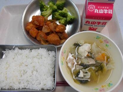 カリッと揚げた魚・茹でた野菜に、甘辛いチリソースをからめてふっくっら美味しい魚料理でした。また、スープもベーコンの香りが引き立ち、野菜の旨味もでてとっても美味しい給食でした。今日も、美味しい給食をありがとうございます。