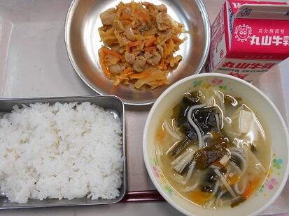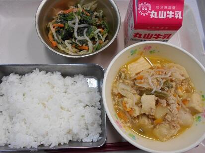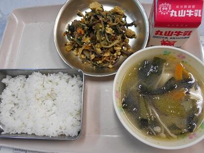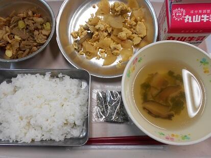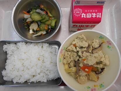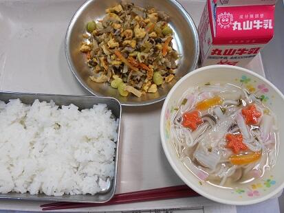 今日の給食は、炒り豆腐。とはいっても一般的な豆腐そのものを使用している炒り豆腐ではありません。高野豆腐を粉末にしたものを使用して作っています。味は、豆腐で作って炒り豆腐のようですが、食感がふわふわしっとりなんともいえぬ美味しさです。