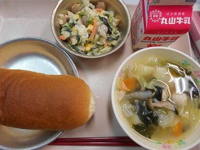 今日の給食の肉団子スープ。優しい味わいで美味しくいただきました。サラダも野菜がしゃきしゃきしていてツナと調理員さんの作ってくださったドレッシングが、からんでとても美味しいサラダでした。