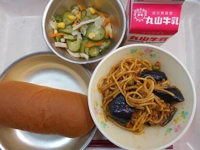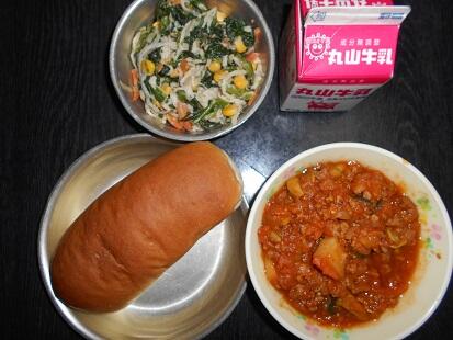 『ミートソース煮はかぼちゃやじゃがいもも食べやすくきざんであり、ソースの味もよく子どもたちは喜んで食べるとおもいました。切り干し大根の食感がよかったです。コーンの甘みもサラダによく合いました。』 給食日誌より