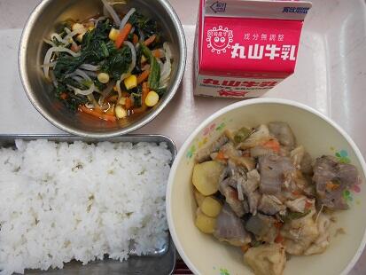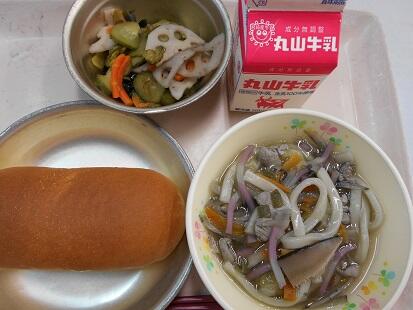 今日の給食のうどん。写真ではわかりにくいですがちょっと黒いのです。東小学校の給食は鉄の鍋で作るのですが、大量調理だからか、その鉄鍋の成分とごぼうの成分が反応して黒くなるようです。しかし、だしのきいたうどんはとても美味しいうどんでした。梅風味あえは、れんこんを梅風味であえたものでさっぱり味で美味しかったのですが、苦戦する子もいたようです。まず、梅の味が苦手、そして、れんこんを食べなれないのか好まない様子でした。そもそも、乳幼児は「酸味=腐敗物や未熟な果実のサイン」ということで、本能的に拒絶するということを聞いたことがあります。なので、酸味は苦手なこどももいるようです。