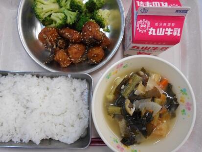 6月と言えば梅の旬です。子ども達に今は梅の収穫時期で、収穫した梅を加工して梅干しを作る時期なんだという事を知って欲しいと言う想いから『紀州汁』を献立にいれてみました。いりこで出汁をとり梅干しを入れて風味づけをしています。梅風味のさっぱりしたすまし汁。今日も給食美味しかった(^^)/と思っていると、子どもたちからは、「先生!今日の汁、苦手でした。」「えー、私は美味しかったです。また、給食で出して下さい。」などなど。賛否両論。魚の磯辺揚げは、カリッとした衣にふわっとした白身魚、海苔の風味もとっても美味しく好評でした。