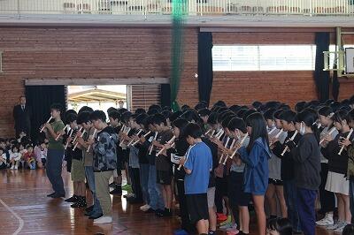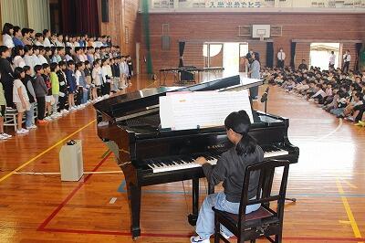 昨日(水曜日)、体育館から「校歌」と「さんぽ」の歌が聞こえてきました。