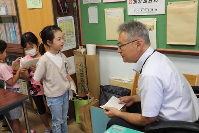 生活科の時間に、1・2年生が「学校たんけん」を行っていました。2年生が1年生を案内したり、教室等の説明を担当しています。1年生は、説明が終わると2年生からシールを貼ってもらい、うれしそうにしていました。いつも以上に、2年生がお兄ちゃん、お姉ちゃんとして頼もしく思えました。
