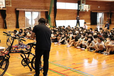 6月6日(火)、延陵自動車学校さんを講師に招き、低・中・高学年ごとに交通安全教室を実施しました。あいにくの雨天であったため、体育館での実施となりましたが、交通ルールやマナーを再確認するとともに、自転車シュミレーターの体験をとおして、安全な自転車の乗り方を学びました。