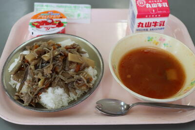 6月7日(水)、給食のメニューは、かみかみメンマ丼・洋風五目スープ・アセロラゼリーでした。かみかみメンマ丼には、放置竹林問題の解消で注目された「延岡メンマ」が使われていました。