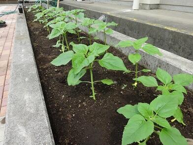 理科の授業で育てているヒマワリです。土の管理がよいので、グングン育っています!