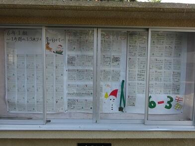 校門掲示板には、在校生から6年生への卒業メッセージが掲示されています。