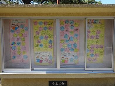 【3月の校門掲示板には、1年生から卒業生に向けてのお祝いメッセージが飾られていました。仲のよい1年生と6年生でした。】