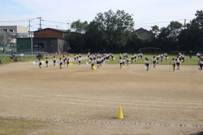 次第に気温が上がり始めた3時間目に、3年生が運動場で走りました。