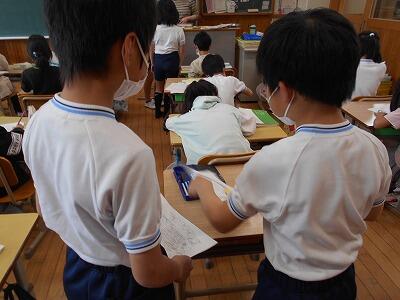 先日、「考え、議論する道徳」についての記事をアップしましたが、道徳に限らず全ての学習において「主体的・対話的で深い学び」に向かう授業改善が求められています。9月8日(木)の2校時にも2・5年生で、子どもたちが自分の考えを書いたノートを手にし、友だち同士で意見交換したり、学び合ったりしている様子が見られました。自分の意見を述べることで考えが整理されるとともに、多様な意見に触れることで考えが深まります。