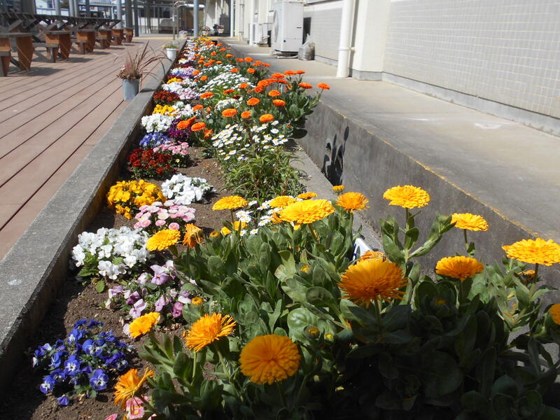 園芸委員会は、花の植え替えに備え、土で汚れた鉢をたわしできれいに洗っています。きれいな花を見るためには、このような地道な活動が必要となります。