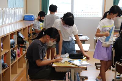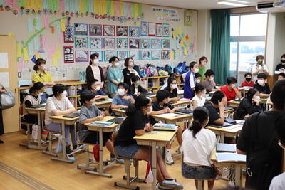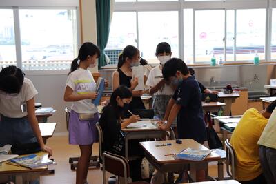 9月14日(水)の朝の時間、運動会の応援練習が行われました。各教室に団長やリーダーが出向き、応援の仕方を教えてくれました。1年生は、小学校はじめての運動会ですので、ていねいに教える様子が見られました。今年度の応援も、新型コロナウイルス感染症対策として、リーダー以外は声を出さずに身振り手振りのみでの応援となります。各団の特色ある応援を期待しています。