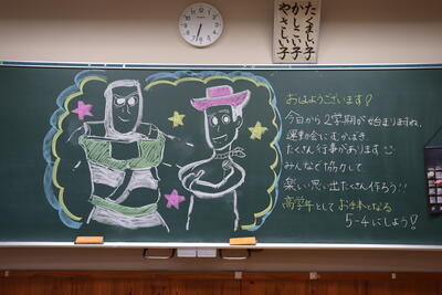 本日から2学期が始まり、学校に子どもたちの元気な姿が戻ってきました。朝の教室を覗いてみると、学級担任が子どもを迎えるために黒板にメッセージやイラストをかいていました。その一部を紹介します。