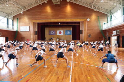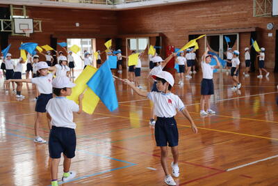3年生は、運動場でリレー選手を決定した後、体育館で表現の練習を行いました。3年生はフラッグを使っての表現です。旗を振る動き、旗がなびく音もかなり揃ってきたようです。心を一つに、がんばれ3年生!