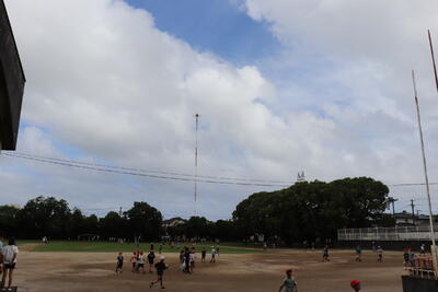 台風11号の接近に伴い、9月6日(火)は市内公立小・中学校一斉に臨時休業となります。昼休みの時点で、まだ雨は降っていませんが、少し風が出てきたようです。河川や用水路が増水しているので、近付かないように指導しています。写真は、本日の昼休みの様子です。子どもたちは、元気に外で遊んでいます。