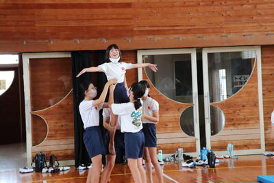 運動会での6年生の表現は、組体操です。体育館を覗くと、サボテンという技を練習していました。まだ、恐る恐るの挑戦のため、先生や友だちから補助してもらいながらの練習です。組体操は、バランスをとったり、自分や友だちの体重を支えたり、総合的な体力を必要とします。本番まで、ちょうど1か月です。小学校最後の運動会で、最高の演技が披露できるようにがんばれ6年生!