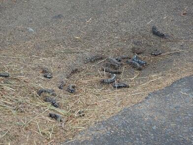 校門のマツにいたマツケムシ。薬剤を散布すると、大量に落ちてきました。これには毒はないそうですが、見た目が・・・。