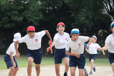 運動会の最後を締めくくる種目は、男女別対団リレーです。各団の代表が力を結集しバトンをつなぐ、運動会のクライマックスです。1年生から6年生までバトンをつなぐのは、小学校ならではです。どの選手も、団のために懸命に走り抜く姿に感動しました。