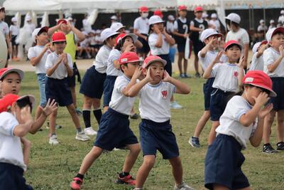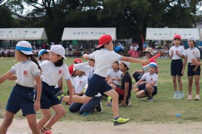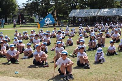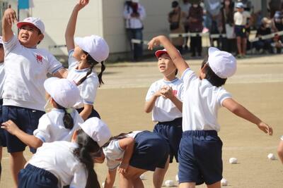 2年生は団技と表現を一緒に行う「大玉ころころ」でした。某北海道の球団の応援で話題となった「きつねダンス」は、とても愛らしかったですね。その後の玉転がしでは、大玉が風で流されるハプニングもありましたが、力を合わせてがんばる姿が見られました。