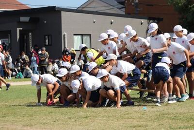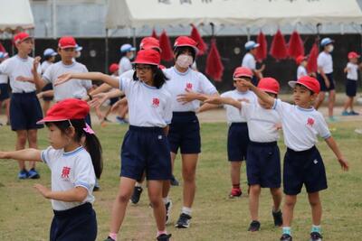予行練習では、低学年の競技は本番と同様に実施しましたが、中学年以上の競技は一部省略して進めました。徒競走では、役員の練習のため3組程度が走り、その後の組は一斉に駆け足でゴールに向かいました。