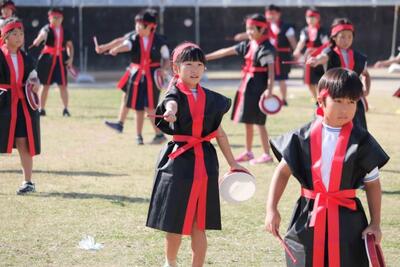 4年生の表現はエイサー「ダイナミック琉球」です。甲子園の応援歌として全国的に有名になった曲です。雄大な沖縄の自然を表した歌詞と鳴り響くテーグ(太鼓)の音が、心を打ちました。4年生の凜々しい表情、よかったですね
