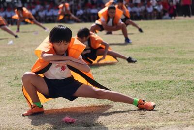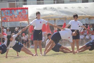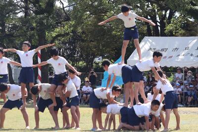 一人技から始まり2人、3人・・・と人数を増やしながら、技を組み上げる6年生。上に立つ人がいれば、それを土台となって支える人もいる。互いの信頼や絆なしには成し得ないものです。これは決して組体操だけのことではないはずです。これからも、その仲間との絆を大切に、輝かしい未来をつくってくれるはず 終了後の6年生の清々しい表情と、6年担任や保護者の皆さんの涙が忘れられません