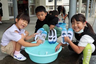 10月20日(金)、1年生が自分のシューズを洗っていました。生活科「ひろがれえがお」では、家族がしていることや家族にしてもらっていることを調べ、自分でできることや挑戦したいことを考えて、実行することができるようになることをねらいに学習を進めています。学校で挑戦しているので、これからはきっと家庭でもお手伝いしてくれるはず・・・多少まわりが水びたしということもあるかもしれませんが、思い切って任せてみることで、できることが増えていくはずです。