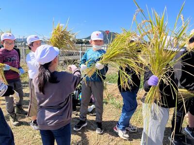 10月23日(月)、5年生が稲刈り・脱穀体験を行いました。6月に田植えしてから約4か月、稲はたわわに実っていました。子どもたちは稲を手刈りし、その後脱穀を行いました。脱穀は、コンバインでも行いましたが、足踏み脱穀機での体験もさせていただきました。ご指導いただきました濱田さん、寺田さん、ありがとうございました。