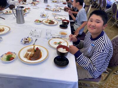 天井のシャンデリアにも負けないほどの、学年主任の輝く笑顔からも分かるように、順調に朝食が始まりました。今日1日を乗り切るために、しっかりと栄養を蓄えてくださいね。食後に「普段よりたくさん食べられました」と教えてくれる子が多くいました。椅子を入れたり、ゴミを拾ったりと場を整える姿も見られ、すがすがしい気持ちになりました。