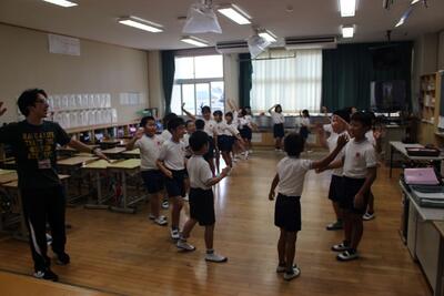 1年生は、先生の踊りを見ながら、見よう見まねで踊っていました。
