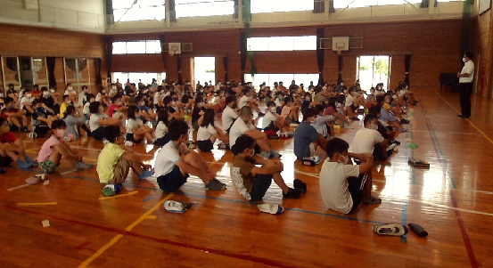 本日(9/2)全校児童で避難訓練を行いました。地震(津波の予報なし)の後、給食室から火災が発生したので運動場に避難するという設定でした。1回目の放送「地震です!」のときは机の下で頭を守り、2回目の放送「火災が発生しました」の後、運動場へ避難しました。子どもたちは「おさない・すばやく・しゃべらない・もどらない」を守り、真剣な面持ちで訓練ができました。2回目の放送から全員の安全が確認されるまでの時間は3分58秒でした。