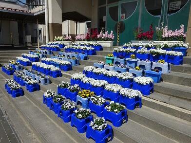 体育館前の階段には、春の花々が飾られました。卒業式を待ちわびているかのようです。