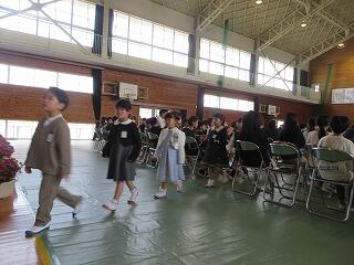 卒業式を終え、卒業生が退場します。それぞれの小学校生活が、走馬燈のように駆け巡っていることでしょう。一人一人の可能性は無限大です。東小での思い出を胸に、大空へ羽ばたいてください。卒業おめでとう