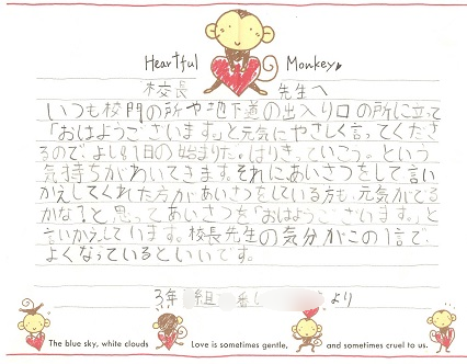 そんな中、ある朝一人の女の子が校長室を訪ねてきました。Mさんという3年生の女の子です。「校長先生、手紙を書きました。読んでください。」と手渡されたのが、このお手紙です。本人の了解を得て掲載します。