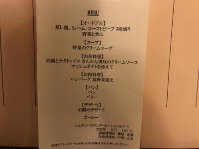 夕食の会場は、シーガイアコンベンションセンターです。メニュー表を見ただけでも、食欲をそそる内容です。広々した会場、円卓の隣との距離も十分で、感染症対策にも配慮いただいています。