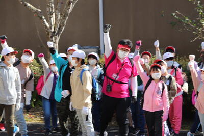 時間はさかのぼりますが9時50分、むかばき山登山のスタートです。5年生全員でかけ声をかけて、元気に頂上向けて出発です。みんな無事に山頂までたどり着けるかな?