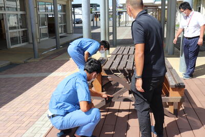 9月21日(水)に延岡工業高校の3年生5名が来校しました。現在、ウッドデッキに設置しているテーブルが、かなり痛んでいたため、寄贈元の延岡工業高校へ相談したところ、地域貢献の取組として新たに制作してくれることとなりました。本日は、テーブルの確認や設置場所検討のための現地視察でした。生徒さんの中には、本校の卒業生や在校生のお兄さんもおり、熱心に確認をしてくれました。延岡工業高校の生徒さん、よろしくお願いします。