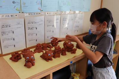 5年生が図工の時間に、粘土細工に取り組んでいました。手元を見ると、シーサーを作っています。シーサーは、沖縄で魔除けとして屋根の上などに設置される守り神です。5の4では、タブレットで作り方を確かめたり、参考画像を検索したりしながら制作を進めていました。個性的で愛嬌のあるシーサー。学校に飾っている間は、東小学校を見守ってくれることでしょう。