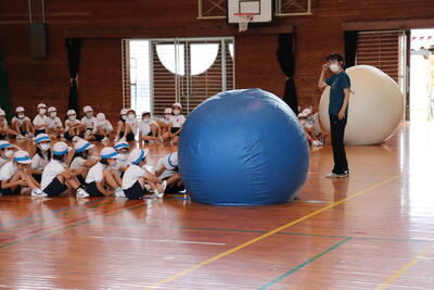 9月27日(火)は、あいにく雨天のため運動会に向けての練習は体育館で行いました。2年生は、団技として大玉転がしを行います。実際に大玉を転がしてみました。1回目が終わり2回目と思っていたら・・・青団の大玉がしぼんでいます。おそらくどこからか、空気がもれてたのでしょう。早速、業者さんに取りに来てもらい修理をお願いしました。2年生の青団のみなさん、大玉が戻ってくるまで、しばらくお待ちください。