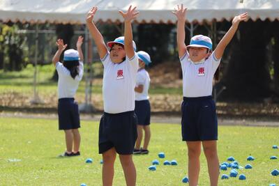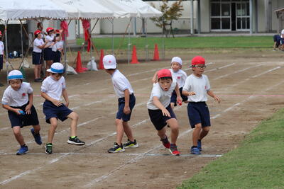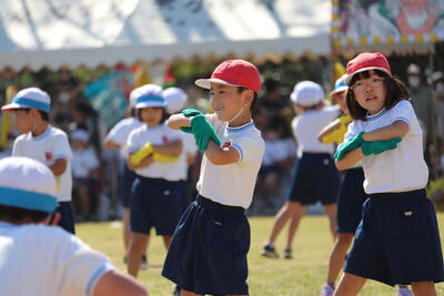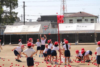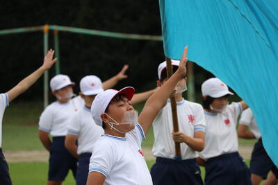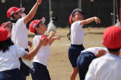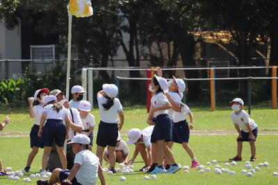 9月29日(木)に1年生は、運動場で団技である玉入れの練習を行いました。高いところにあるかごをねらい、おじゃみを楽しそうに投げ入れていました。低学年では、団技の最中に表現(ダンス)が入ることも、見所の一つです。運動会当日も、かわいらしい1年生にご注目ください。